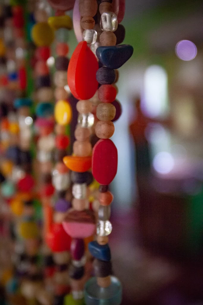 The huts are small, cheerful, and full of personality: beaded curtains, hand-painted details, whimsical quotes, and brightly coloured mosquito nets that somehow feel joyful rather than purely practical. Gardens spill into walkways, balconies come with wicker chairs, and a painted bridge crosses the pool — charming without trying too hard.
