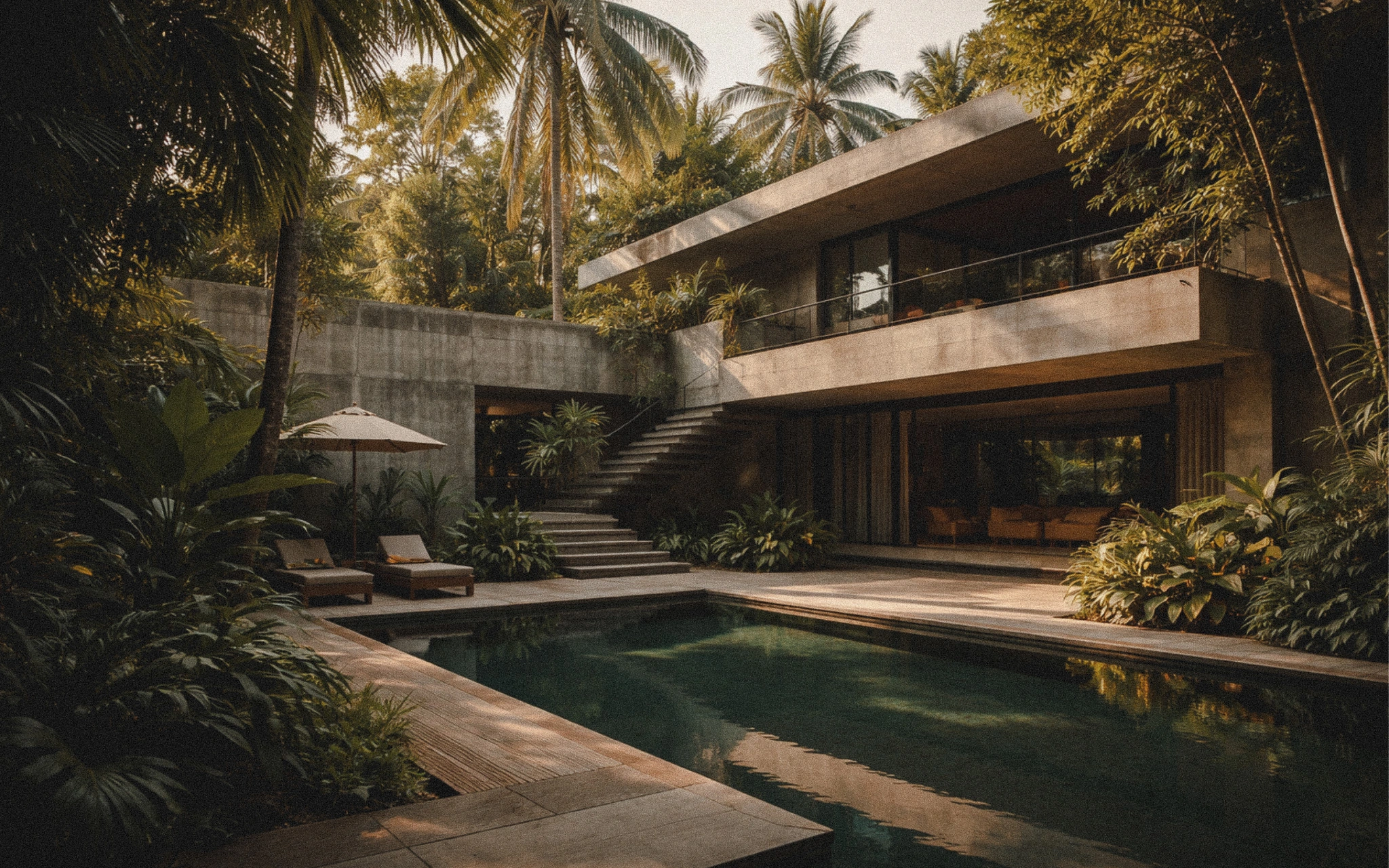 Design-led Bali home with clean architecture, tropical foliage, and warm interior light at sunset